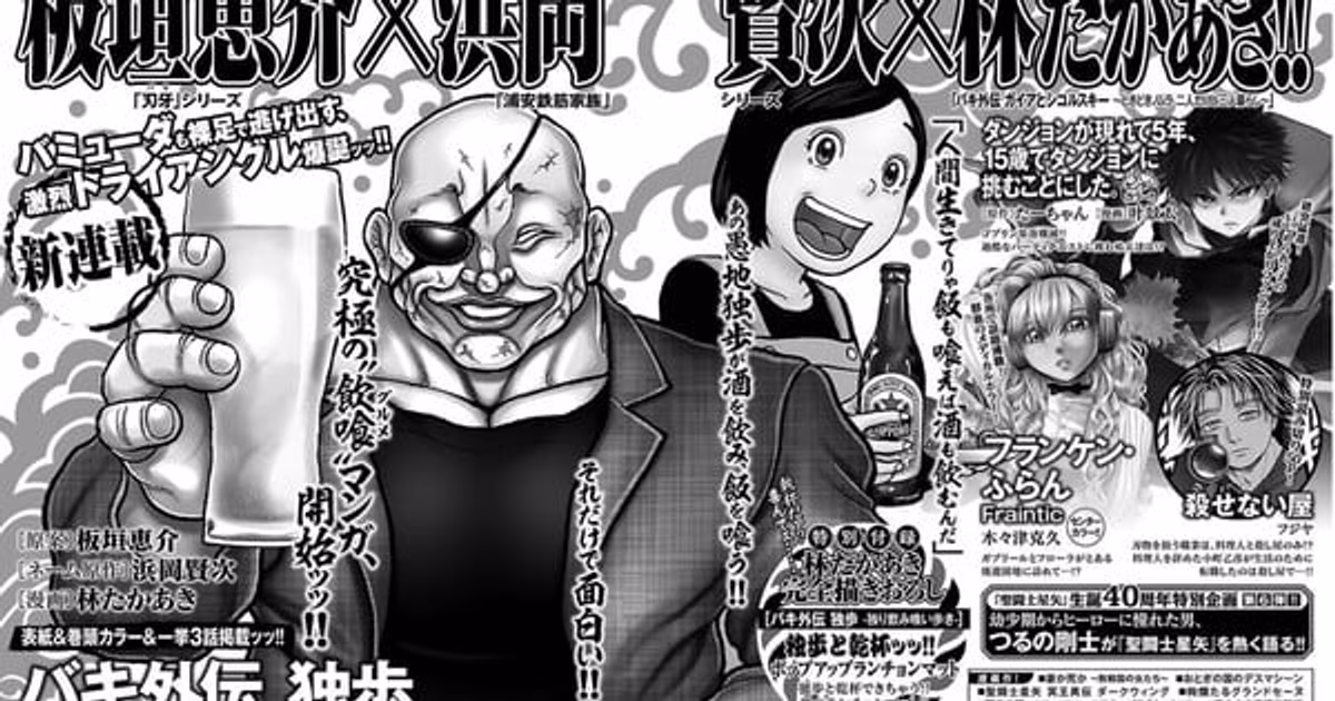 This new series will focus on the solo dining and drinking adventures of Doppo Orochi, known by the nickname 'God of War'. Moving away from the tense and harsh atmosphere of the fighting world, this production will offer readers the opportunity to discover more human and everyday aspects of Doppo. The 'gourmet manga' trend, which has been on the rise in Japan in recent years, thus meets one of the toughest characters in the Baki universe.