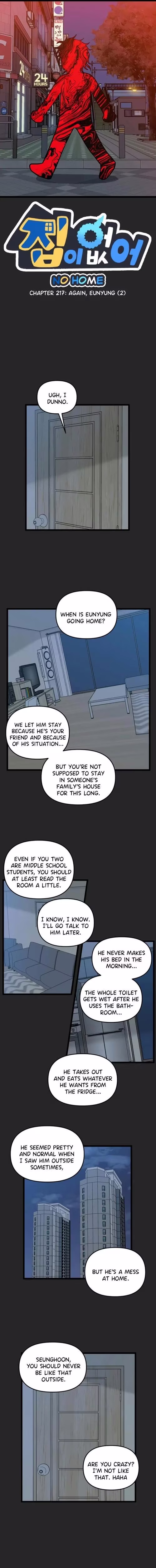 Other thoughts include Eunyung's mom giving off "spooky" vibes and a shoutout to the mysterious sandwich thief (apparently someone's "opp"?!). Lots to unpack in HomelessNo Home Chapter 217, mainly centered on Eunyung's well-being and this fascinating new teacher!