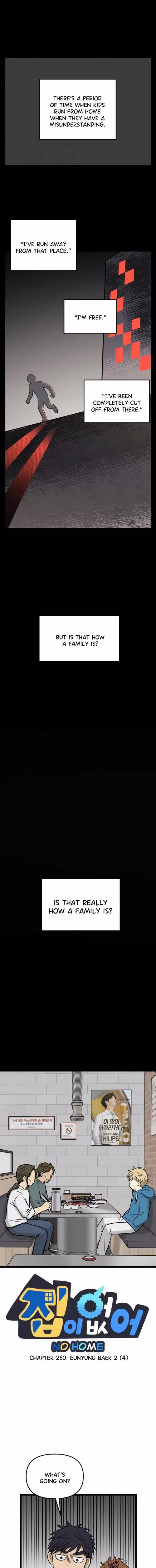 Overall, *Homeless No Home* Chapter 250 left readers intensely disliking the parents, deeply empathizing with Eunyung's struggles, and loving the protective (if chaotic) duo of Haejoon and Juwan. Lots of cries to "CAREFUL, EUNYUNG!" for whatever happens next. Stay safe, buddy!